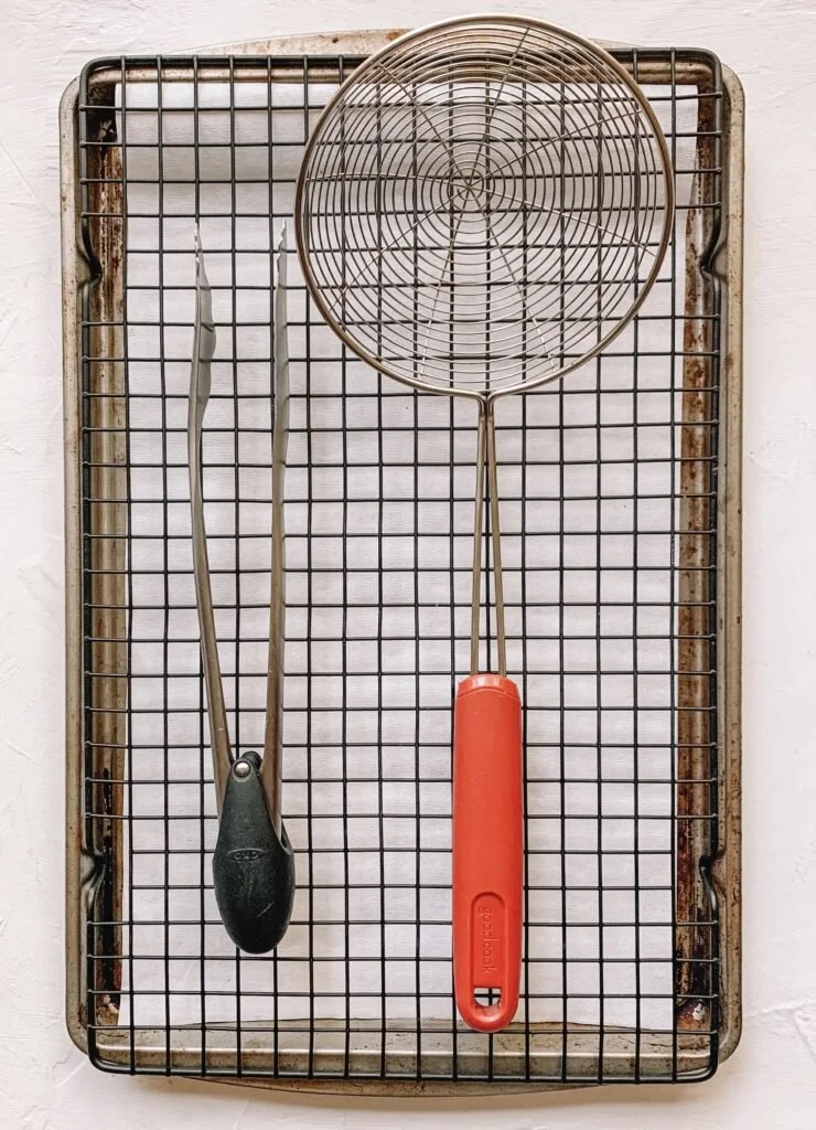 Now, let's get our fry on. I usually fry things outside in my Presto electric skillet. I also have all tools on deck (literally), like tongs, a spider, and a sheet tray with a wire rack to put my chicken on once it's finished frying. Hot grease is not something you want to walk away from to get a tool.