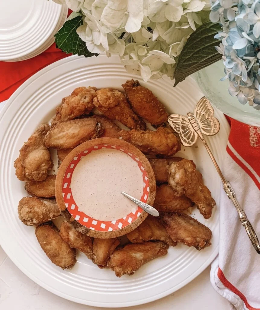 This recipe easily coated five pounds of meaty chicken wings. I use a shallow dish or pie plate to dredge my chicken wings in. Then, I place my coated wings onto a tray covered in wax paper.