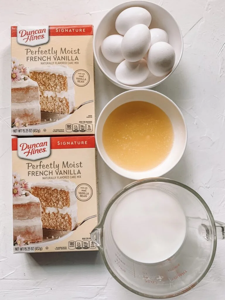 My most recent elevated layer cake was with a new favorite boxed cake mix of mine, Duncan Hines Perfectly Moist French Vanilla. I made this cake for my son to celebrate his first Holy Communion. Each box mix called for 1 cup of water, 1/3 cup of oil, and 3 eggs. I mixed both boxed cake mixes at the same time with 2 cups of whole milk, 2/3 cup or 10 tbsp of melted butter, and 6 eggs.