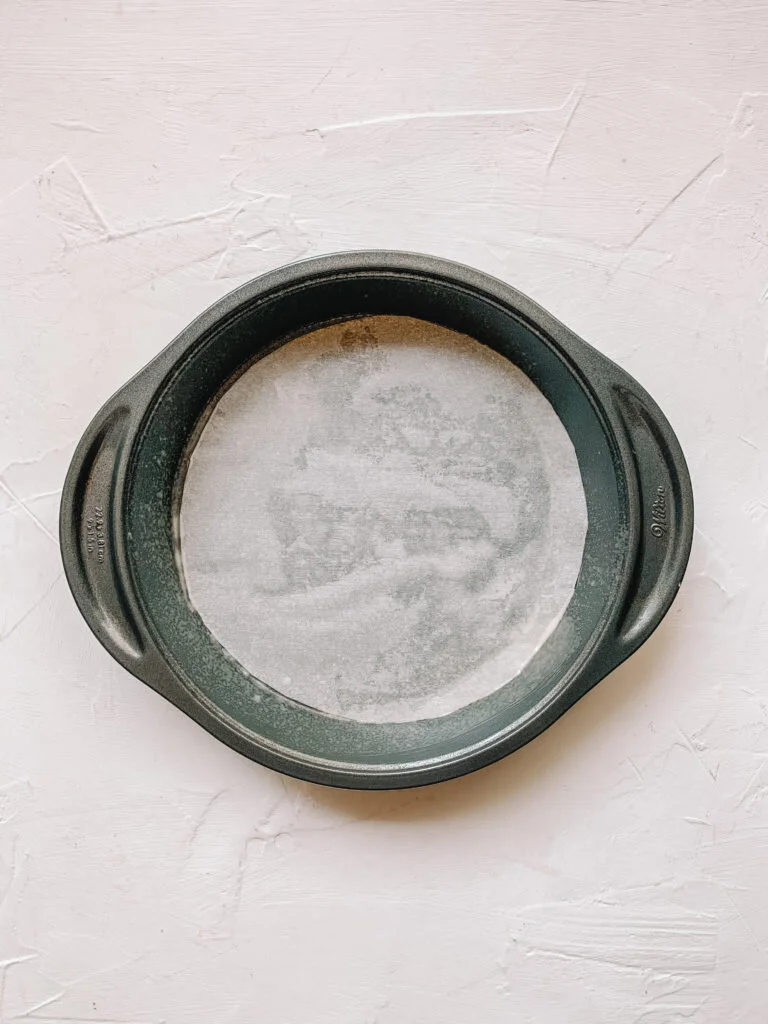 Before mixing your batter, prepare your 9" cake pans by spraying them generously with Baker’s Joy Spray, and then place a piece of parchment paper in the bottom of each round cake pan. Make the circles of parchment paper by tracing the edges of the bottom of a cake pan onto your parchment paper with a pencil before cutting the circles out with scissors.