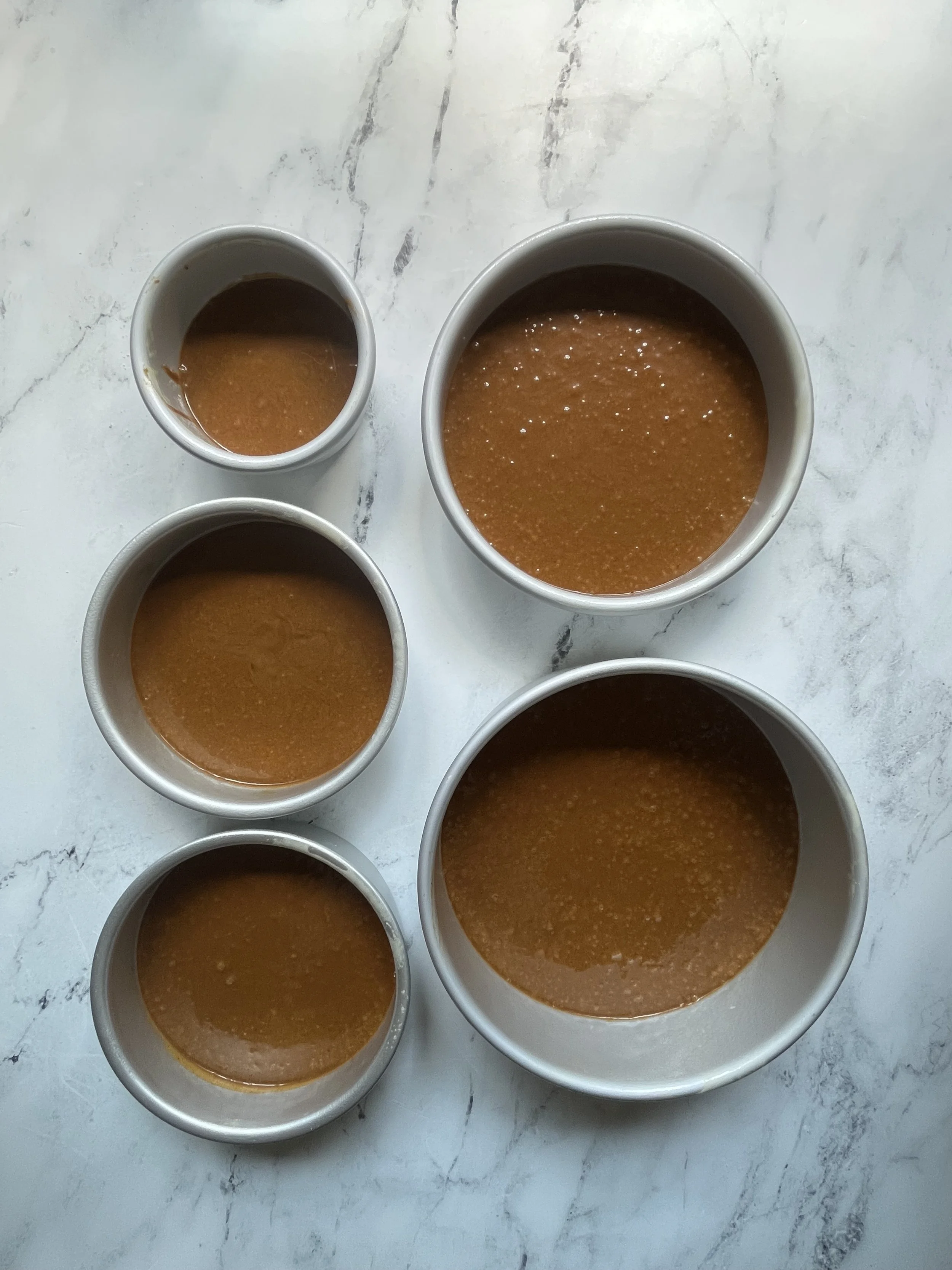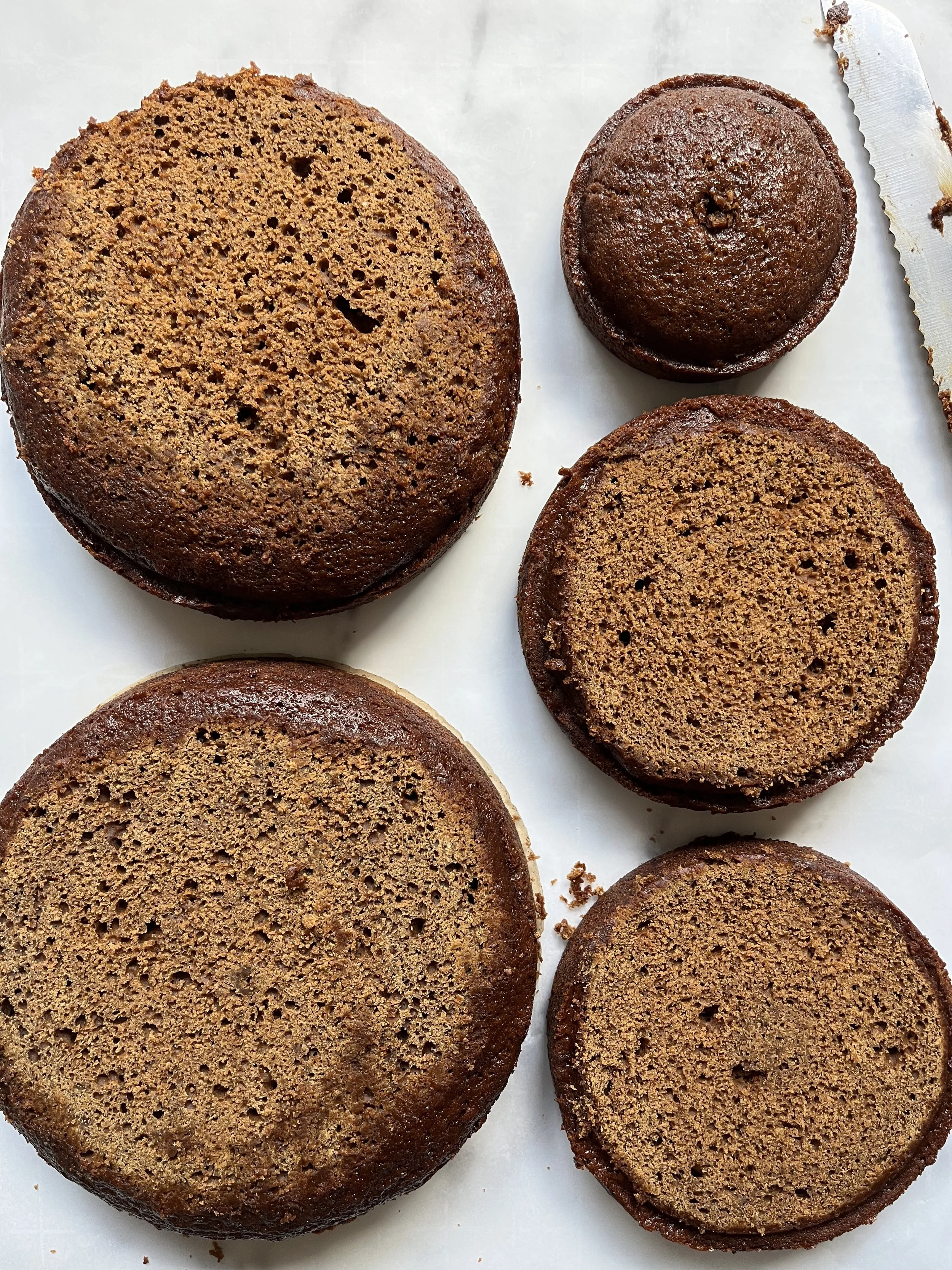 - Preheat oven to 350F/180C degrees. Grease an 8”, 7”, two 6”, and one 4” round cake pans with cooking spray. Line each pan with parchment paper. Working in two batches, start with batch 1 and whisk together your dry ingredients, set aside. In a stand mixer fitted with bowl and paddle attachment, beat together your sugar and butter until light and fluffy. Slowly add in your eggs and molasses until fully combined. Add in your dry ingredients, then slowly add in your hot water until batter is fully combined. Repeat process with second batch of ingredients. Divide batter evenly among cake pans according to pan size. Bake for 25 minutes or until a wooden skewer comes out clean. Allow cakes to cool for 10 minutes before turning them out on a wire rack. Place cake layers into the refrigerator to cool completely.