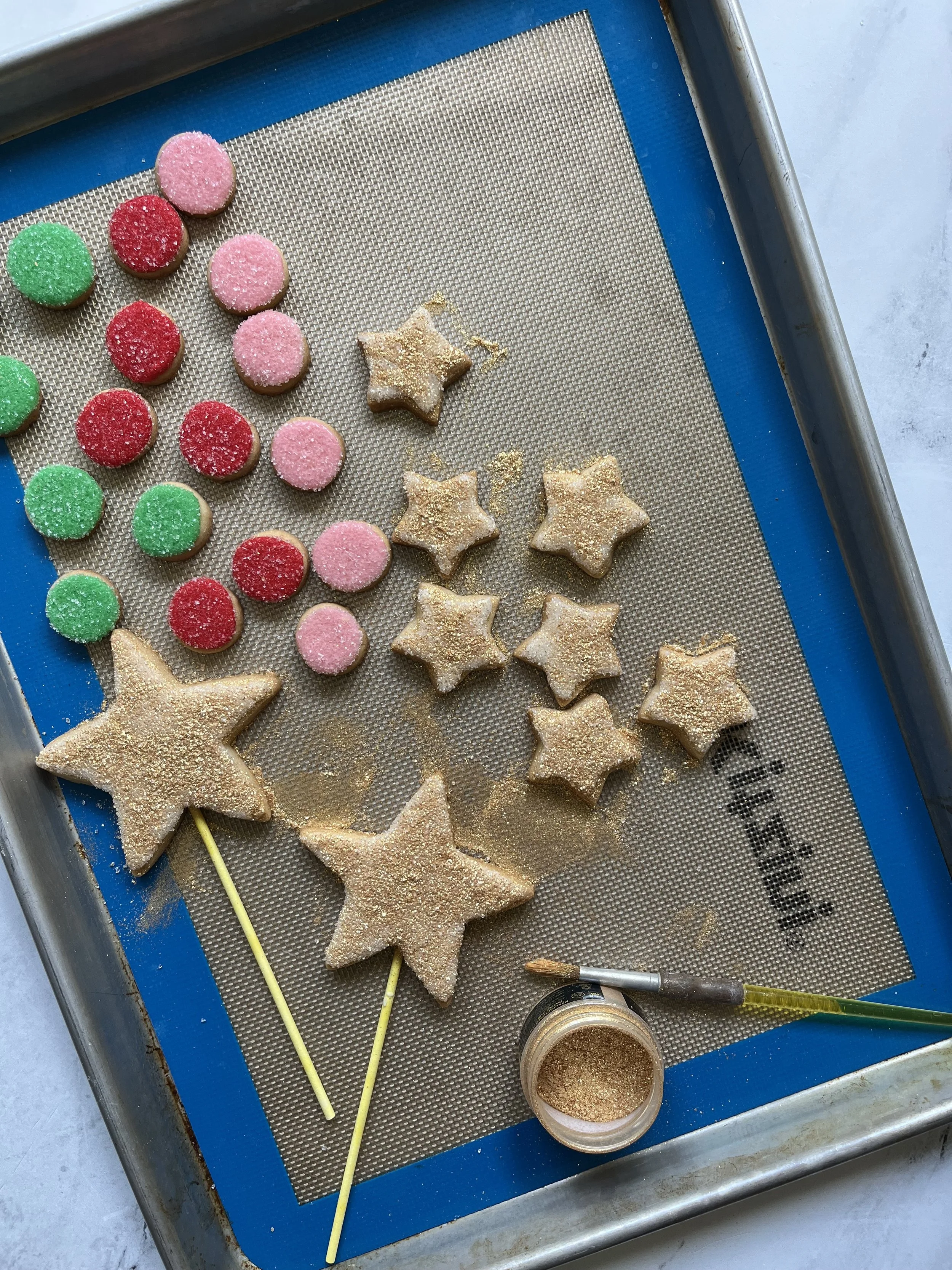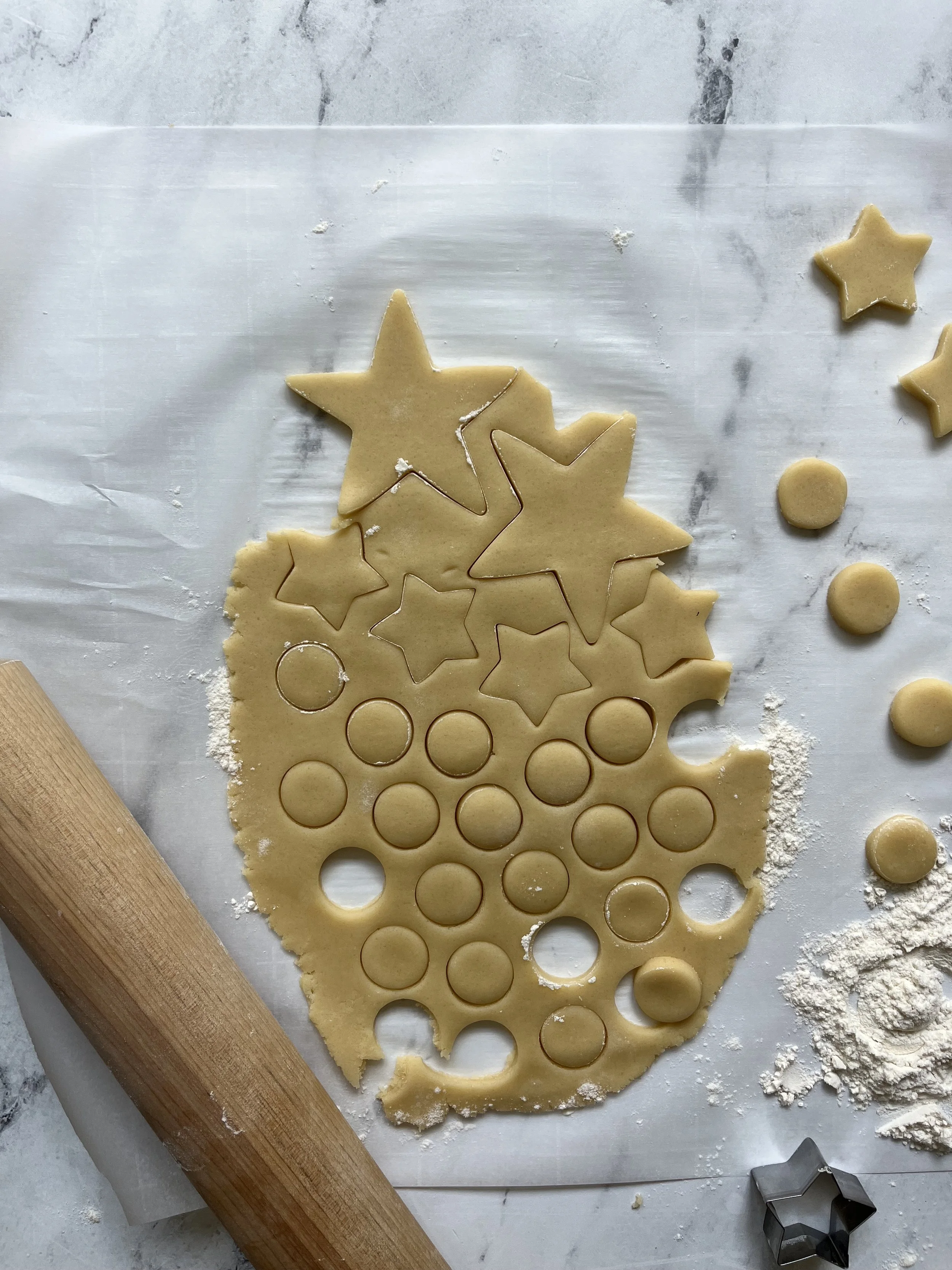 - Preheat oven to 350F/180C degrees Fahrenheit. Whisk baking powder, kosher salt, and flour in a medium size bowl until well combined, set aside. Cream butter and sugar until smooth. Beat in vanilla extract and egg. Slowly add dry ingredients to wet ingredients until well combined and dough is pulling away from the sides of the mixing bowl. DO NOT CHILL, turn dough out onto a lightly floured surface. Roll dough to 1/4 inch thickness. Create a star cookie cake topper with dowels. Cut cookies with a cookie cutter and bake for 8-10 minutes or until the edges turn slightly golden. Remove cookies from the oven and allow to cool for 1-2 minutes on your baking sheet, before transferring to a cooling rack.