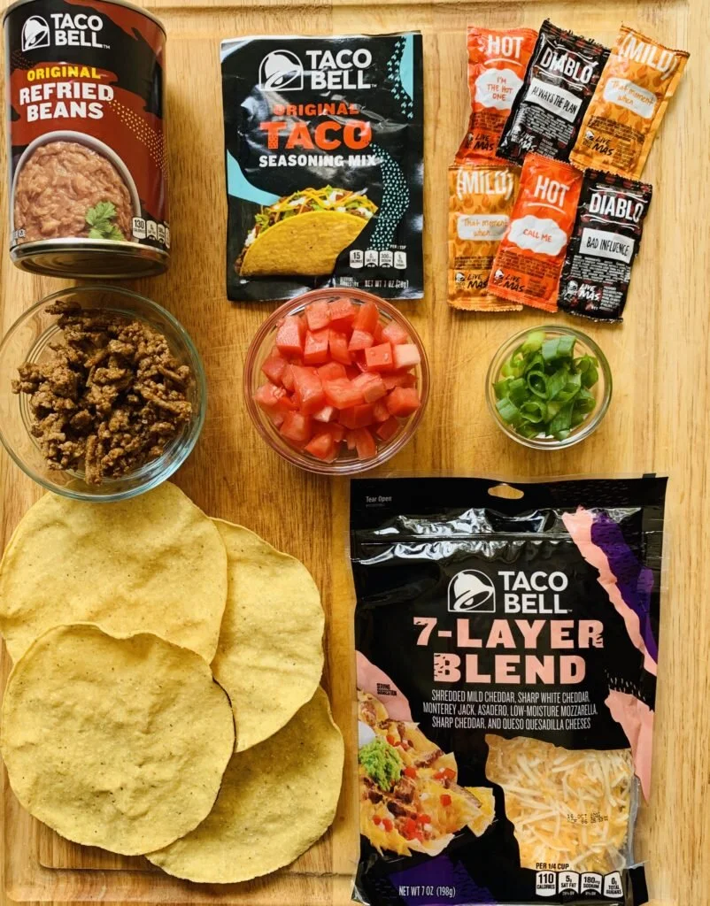 *Taco Bell carries their own line of products at most large grocery chains. I opted to use Taco Bell’s shredded cheese, refried beans, taco seasoning, and mild sauce in my recipe.