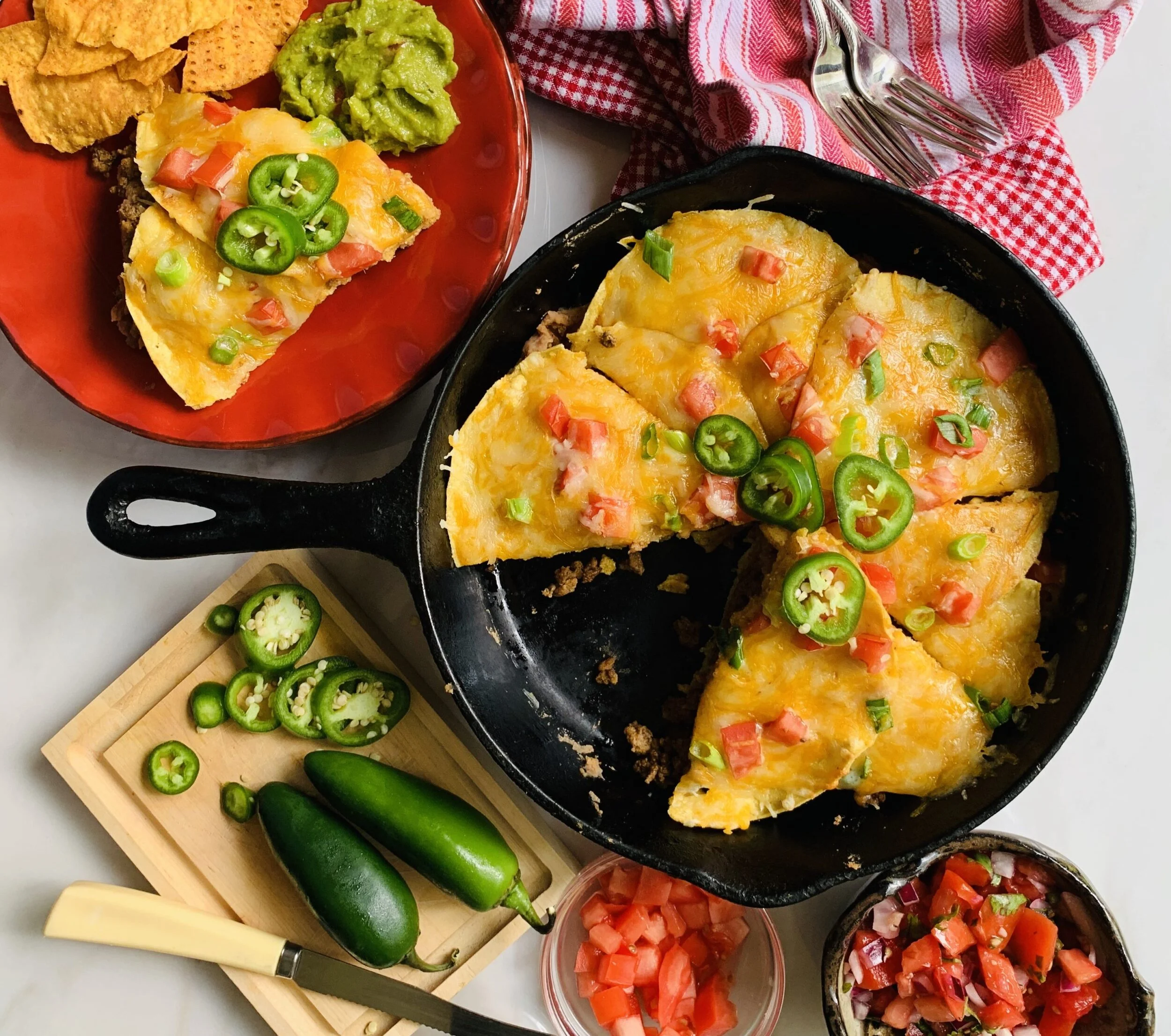 Bake at 350 degrees Fahrenheit for 6-8 minutes, or until cheese is completely melted. Remove the skillet from the oven and slice into 6 wedges. Serve with a side salad and/or tortilla chips and guacamole.