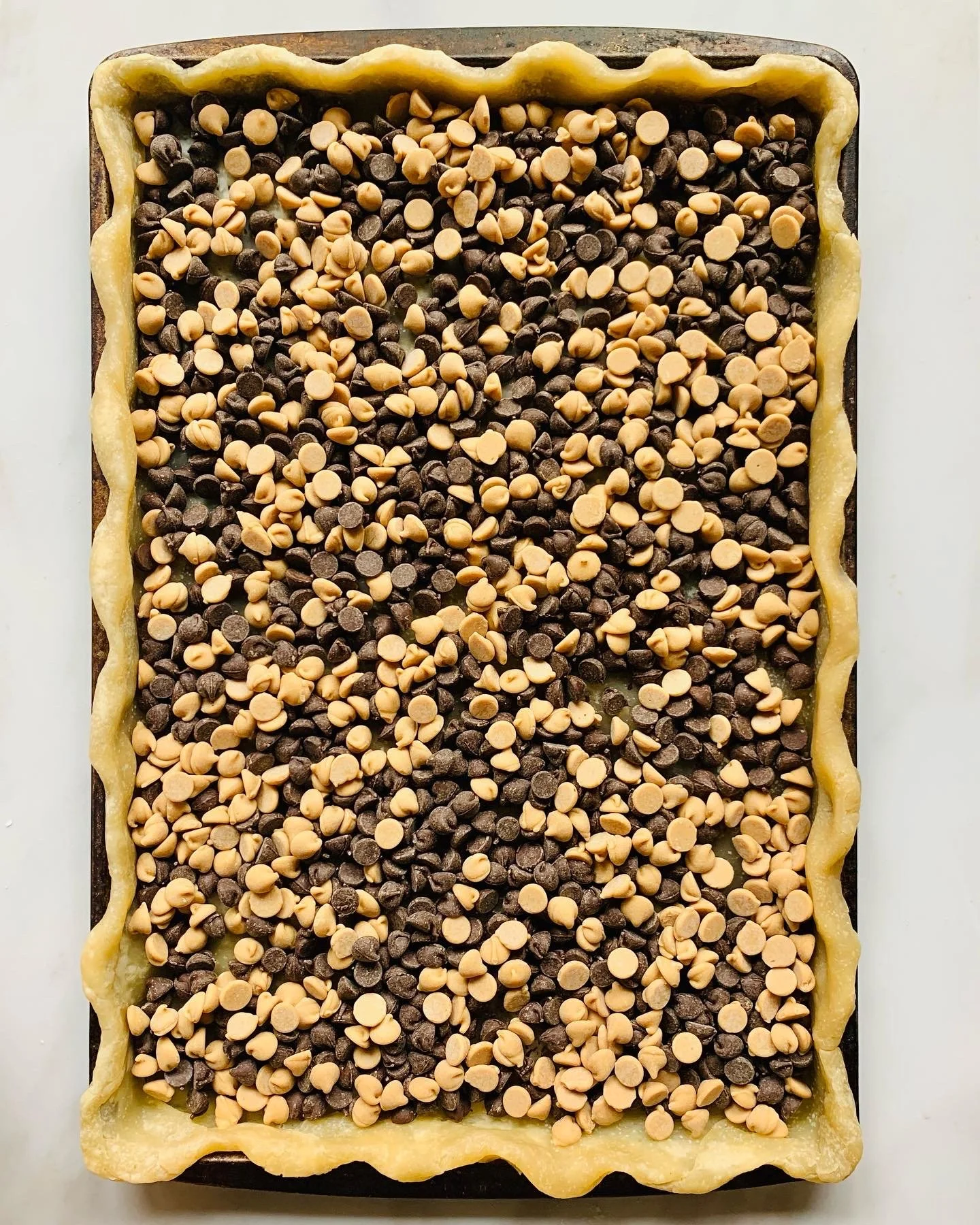 Spread peanut butter chips and chocolate chips evenly over your prepared pie crust and set aside.