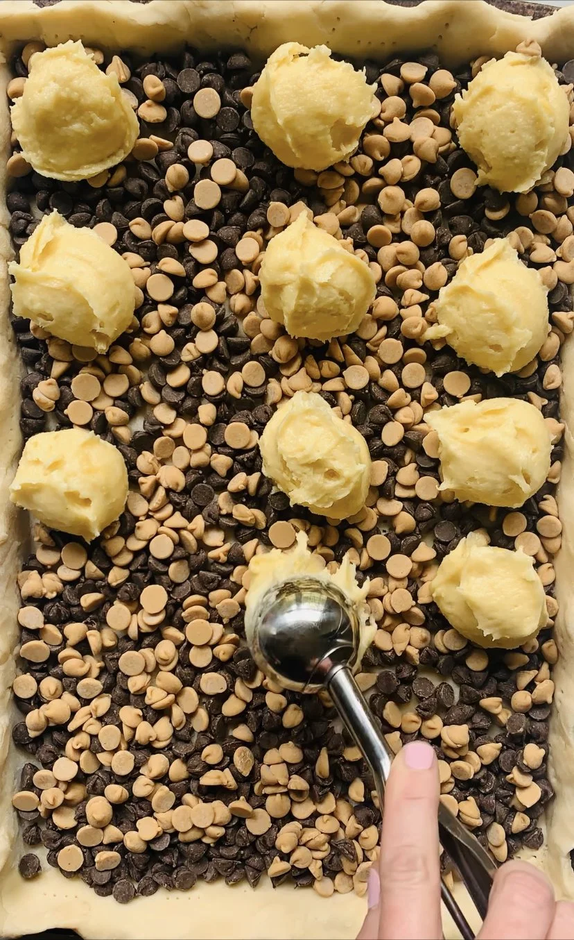 Using a stand mixer or a handheld mixer, beat your butter on medium speed for about 30 seconds. Add in your beaten eggs and vanilla extract and continue to mix on medium speed for about 1 minute. Turn your mixer to low and add in the sugar flour mixture one large spoonful at a time until all ingredients are fully incorporated. Using a large spoon or an ice cream scoop, dollop this mixture evenly over the peanut butter and chocolate chips.