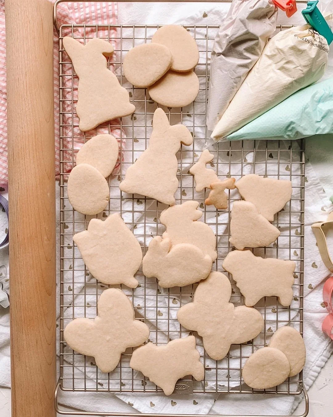 Add dough disc to a lightly floured surface. Using a lightly floured rolling pin, roll out dough to about 1/4” thickness. Using cookies cutters or the top of a cup or glass, cut out sugar cookies and place them on a baking sheet fitted with a silpat or a piece of parchment paper, leaving a 1” space in between the cookies. Re-roll dough and repeat this process until all the dough is cut into shapes.