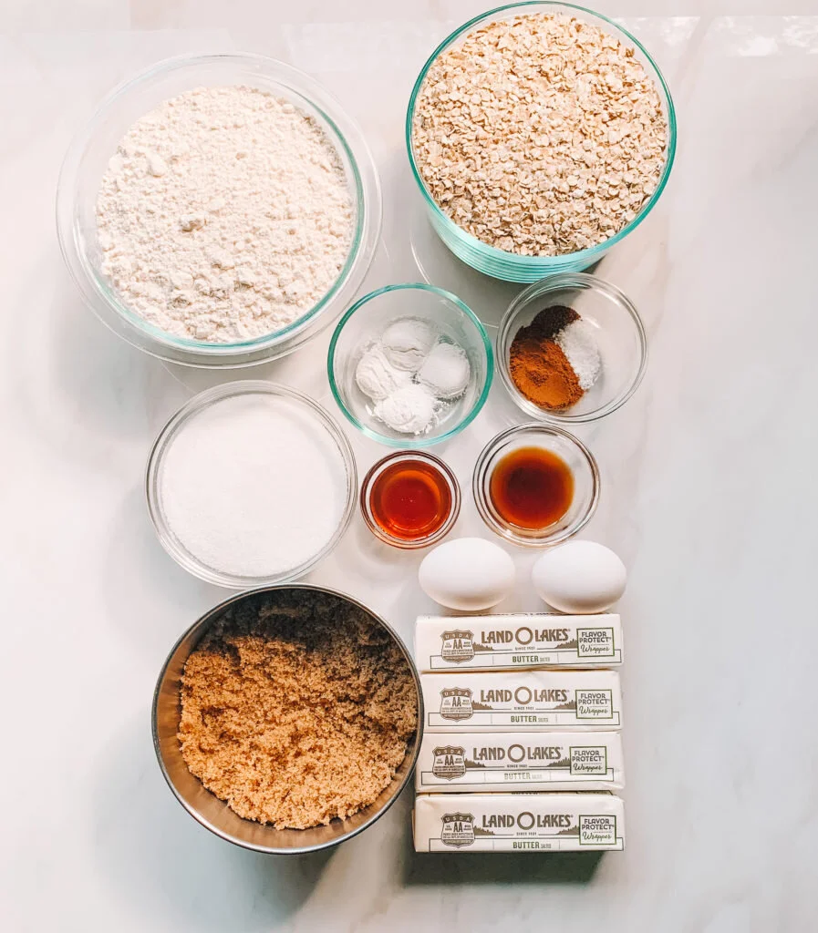 I’m a big fan of dessert bars!! If you’ve stopped by website before you may have read about the Neiman Marcus Bars or Funfetti Butterscotch Blondies I enjoy making. So why not join a dessert bar with a delicious cookie to create a delightful dessert, or maybe a breakfast if you live at our house. This time I put a twist on the classic oatmeal cookie by developing a THICK, soft oatmeal cookie bar recipe. Here are the ingredients you will need to make my oatmeal cookie bars.
