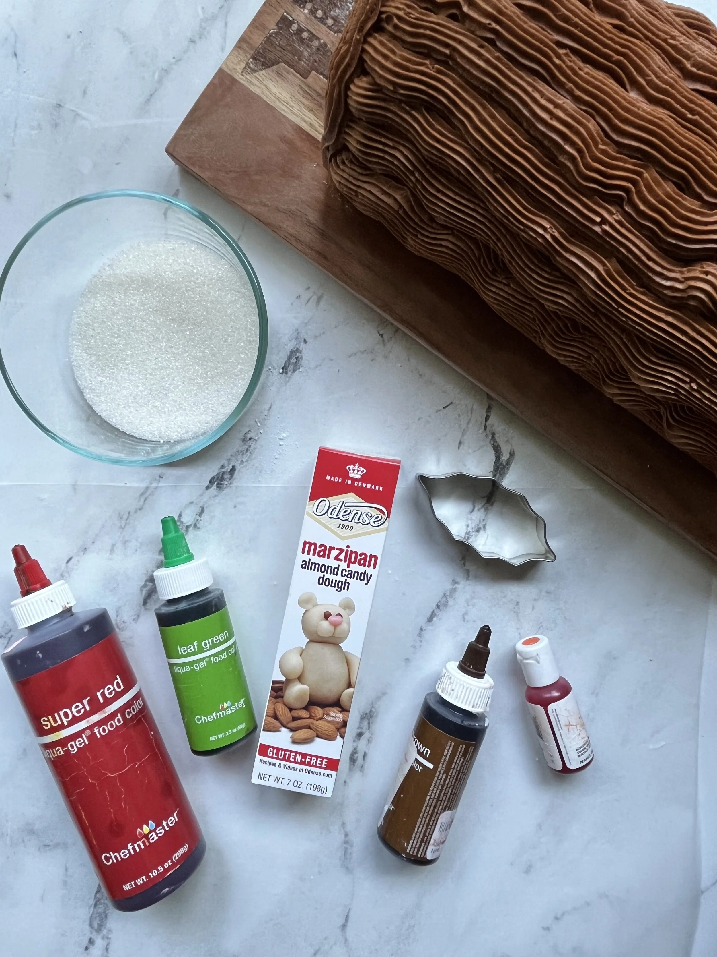 - Use marzipan, food coloring gels, sliced almonds, and white sanding sugar to create pine cones, berries, leaves, and a candle to decorate the log.