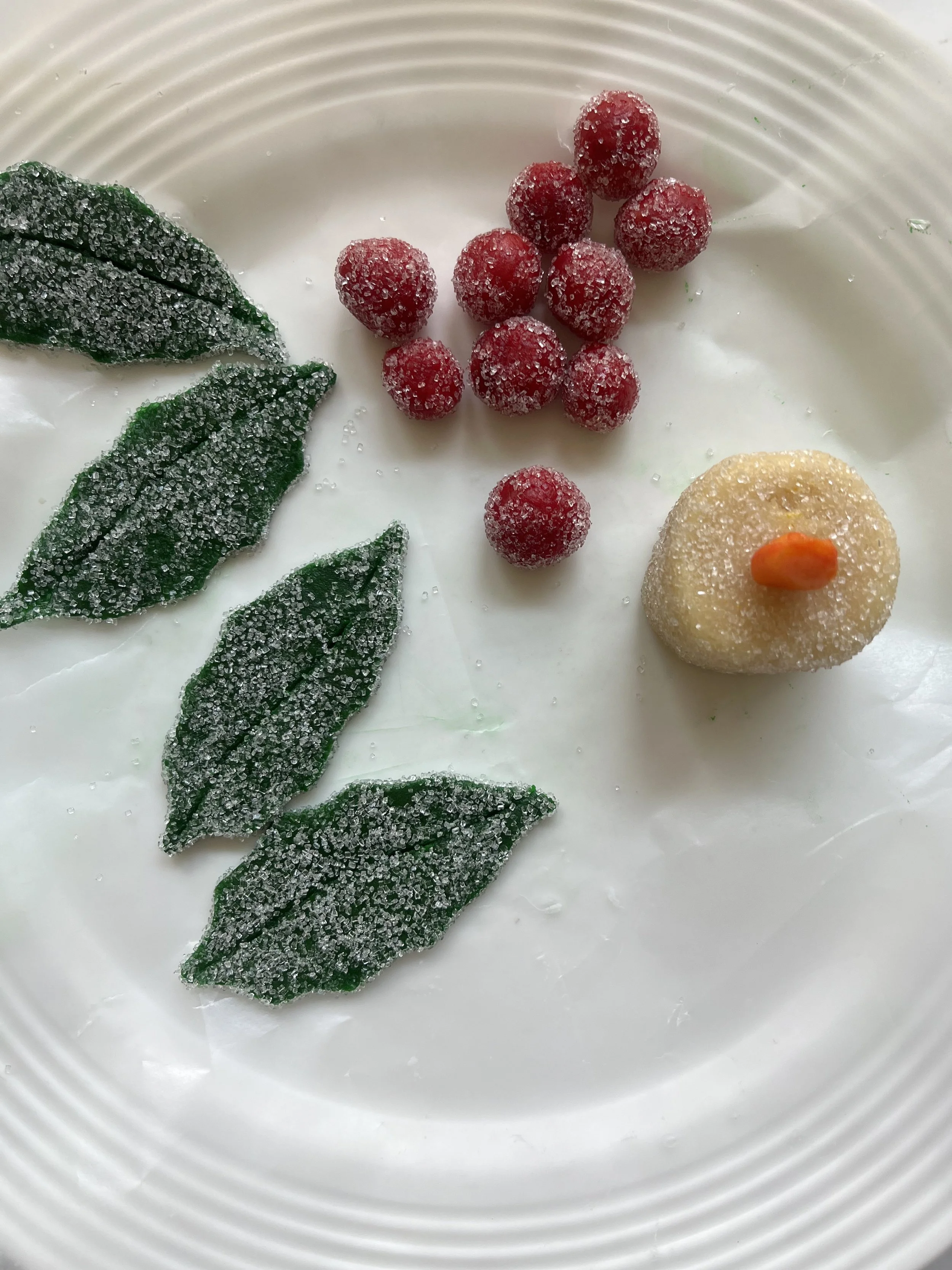 - Slice off 15 grams of marzipan and use 5ml of green dye to color the marzipan. Roll marzipan into 1/4 inch thickness and use holly leaf cookie cutter to cut 6 holly leaves. Dip leaves in sanding sugar and set aside.