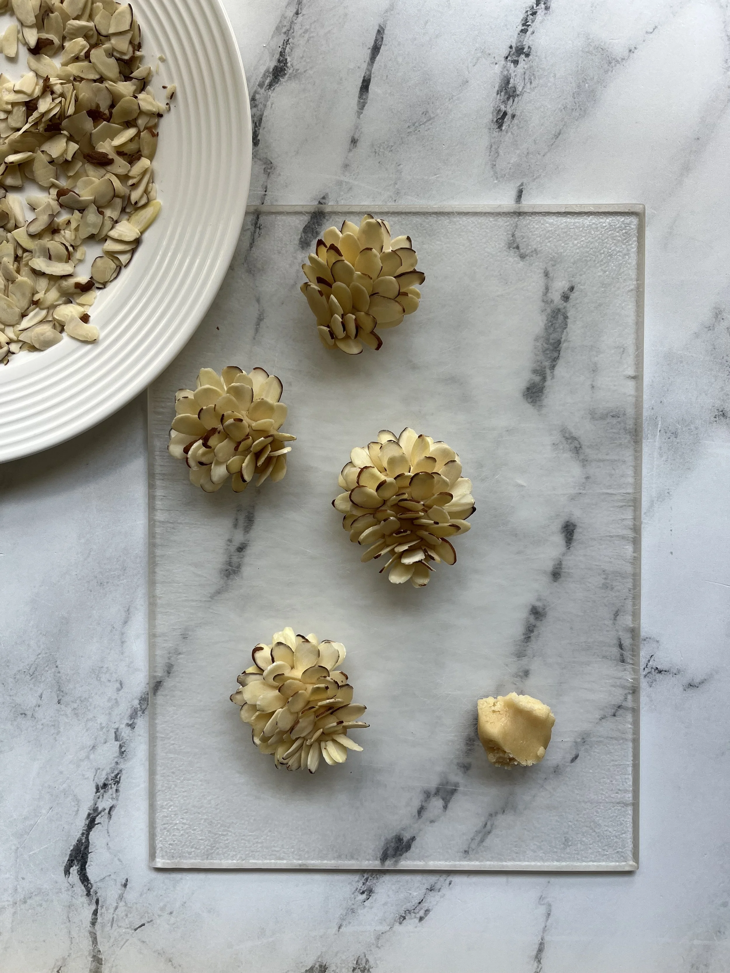 - Roll 90 grams of marzipan into an egg shape. Carefully place sliced almonds into marzipan to create pine cones.